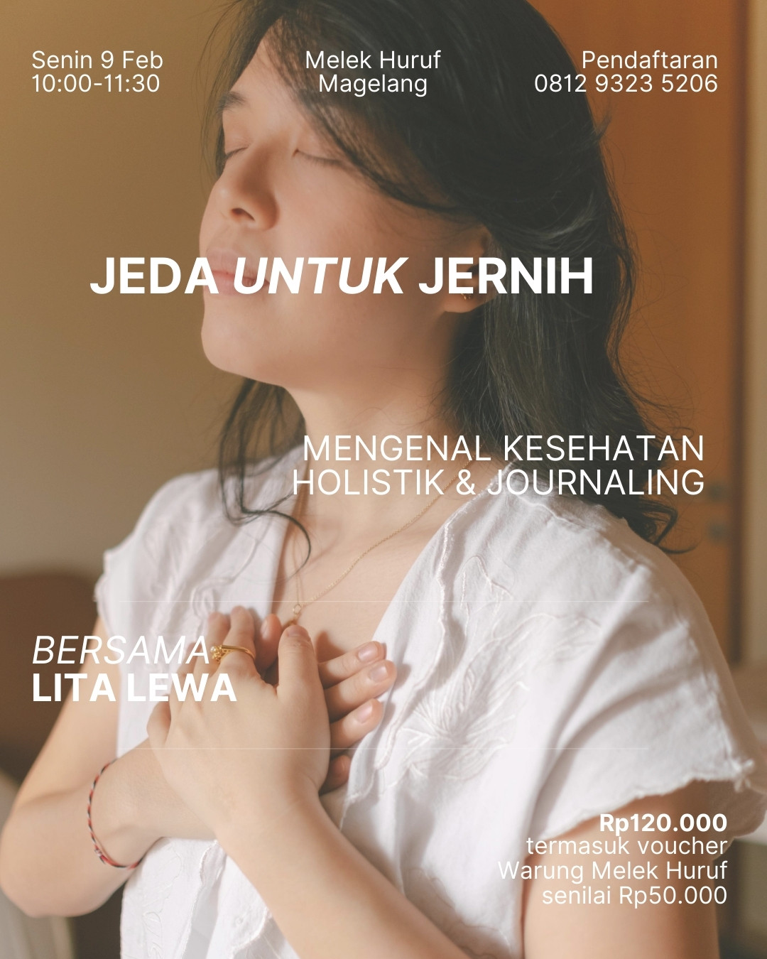 We open between 09.00-18.00 WIB every Sunday-Thursday, and 09.00-21.00 every Friday and Saturday. Please book via WhatsApp (+62812 9323 5206) and email (melekhurufmagelang@gmail.com) before visiting.