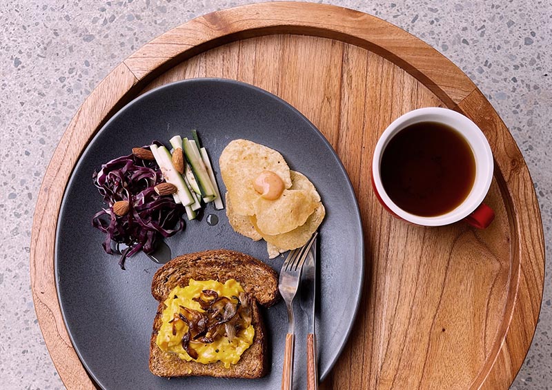 We serve comfort food cooked in our kitchen using local ingredients, with the side of coffee and local snacks. Visitors can also bring home local chocolate bars made by our partner.